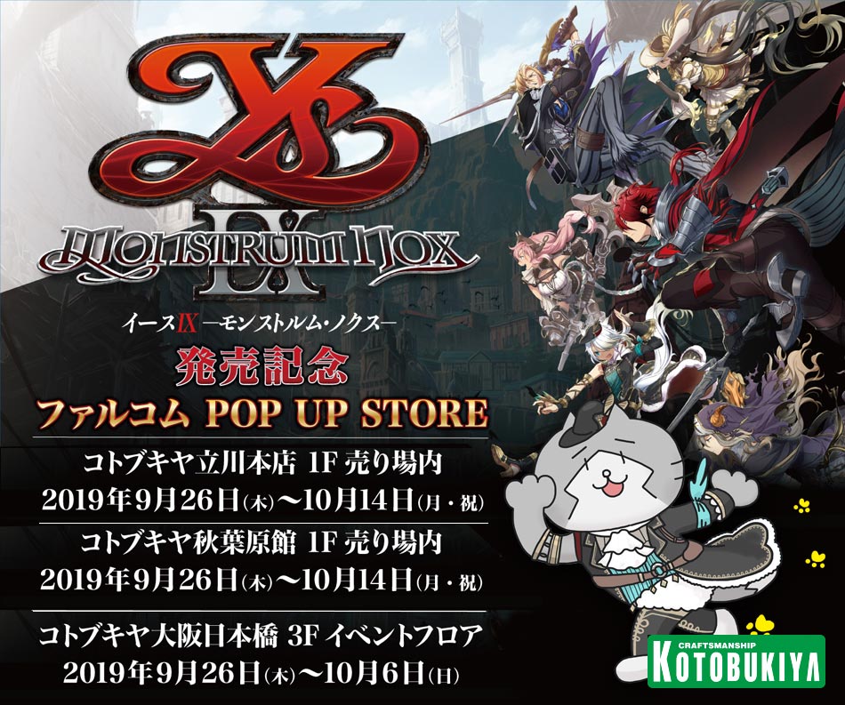 「イースIX」の発売を記念して、下記期間限定でファルコムショップがコトブキヤに登場!新柄を加えた『タイトル缶バッジ』ガチャや、「イースIX」キャラの衣装をまとったゆるみっしぃデザインの購入特典もご用意。