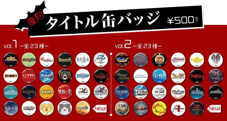 イベント期間中、ファルコム関連商品3,000円お買い上げ毎に、限定缶バッジを1つプレゼント!イースIXのアドル/白猫/人形の衣装をまとった【ゆるみっしぃ】3種と、立川市公認なりそこねキャラクター【ウドラ】&【ゆるみっしぃ】のコラボデザイン1種、計4種をご用意。